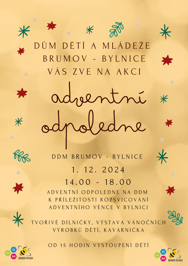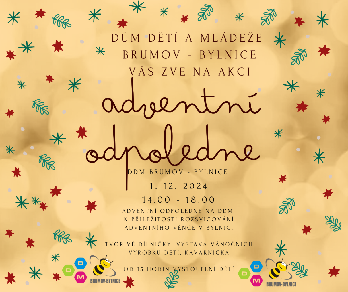 Dům dětí a mládeže vás všechny srdečně zve na adventní odpoledne při příležitosti rozsvícení adventního věnce s tvořivými dílničkami pro děti, výstavou výrobků dětí, občerstvením a vystoupením dětí