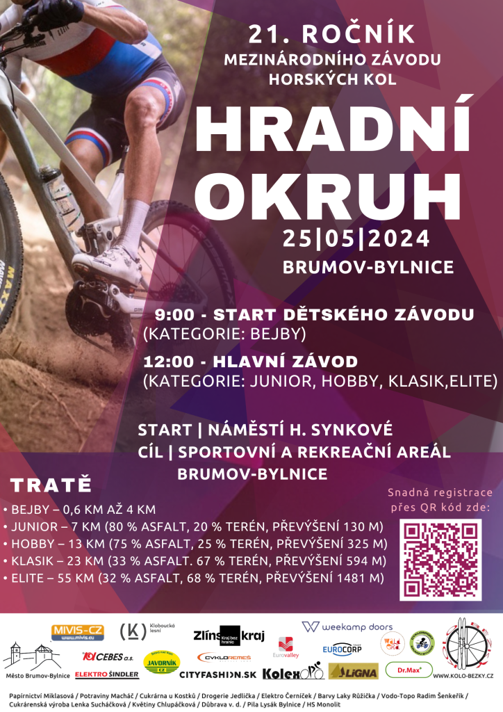 Město Brumov-Bylnice a Sportovní klub Brumov-Bylnice, z. s., Vás v sobotu 25. května 2024 zve na 21. ročník mezinárodního závodu horských kol Hradní okruh.