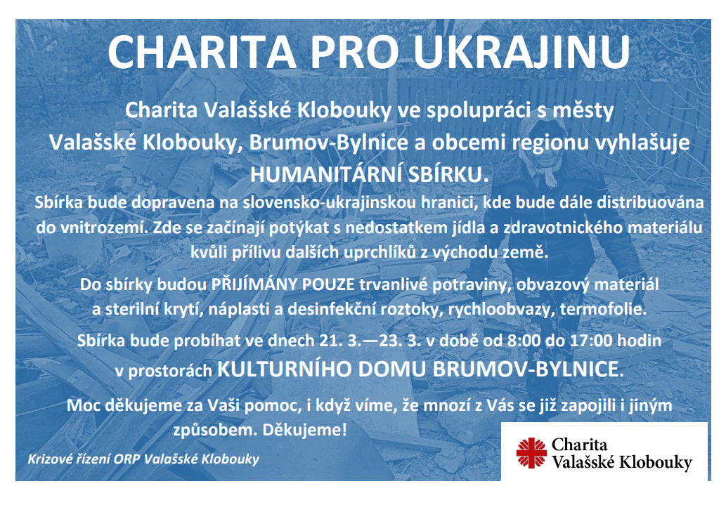Charita Valašské Klobouky ve spolupráci s městy Valašské Klobouky, Brumov-Bylnice a obcemi regionu vyhlašuje HUMANITÁRNÍ SBÍRKU.