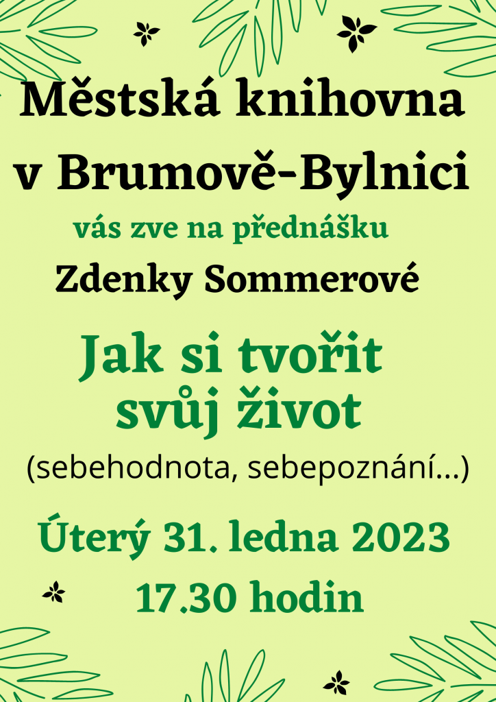 Městská knihovna v Brumově-Bylnici vás zve na přednášku Zdenky Sommerové Jak si tvořit svůj život a udržovat se na vyšší energii Úterý 31. ledna 2023 17.30 hodin