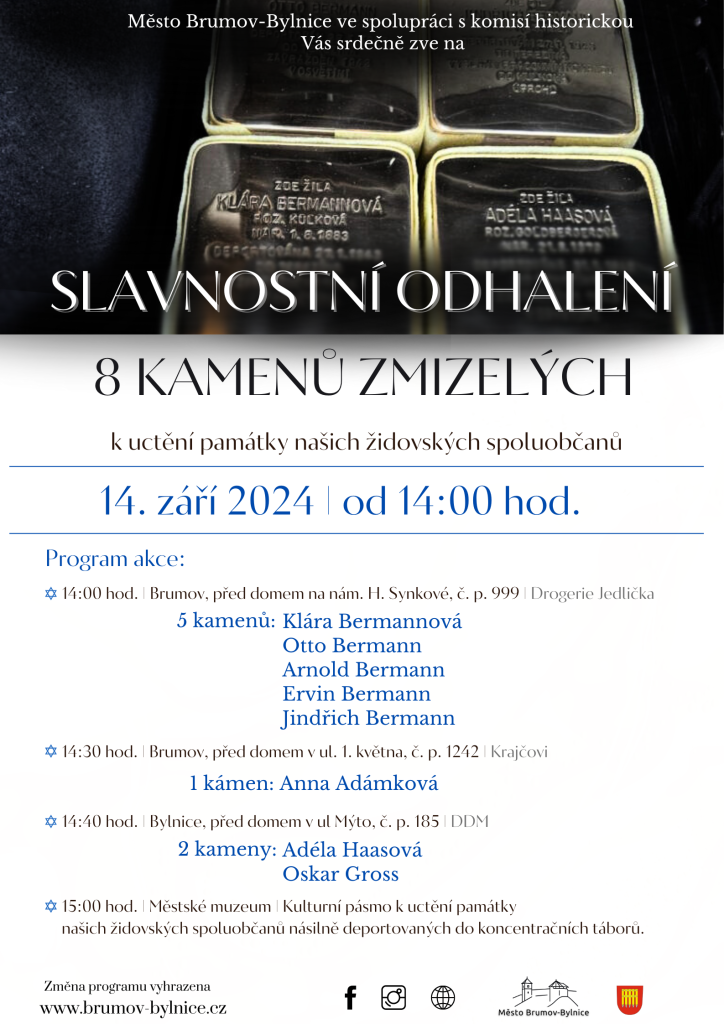 Setkání a vzpomínkové odpoledne v Městském muzeu, hudební doprovod - židovská hudba. Společný přesun na pietní místa a odhalení "kamenů zmizelých"