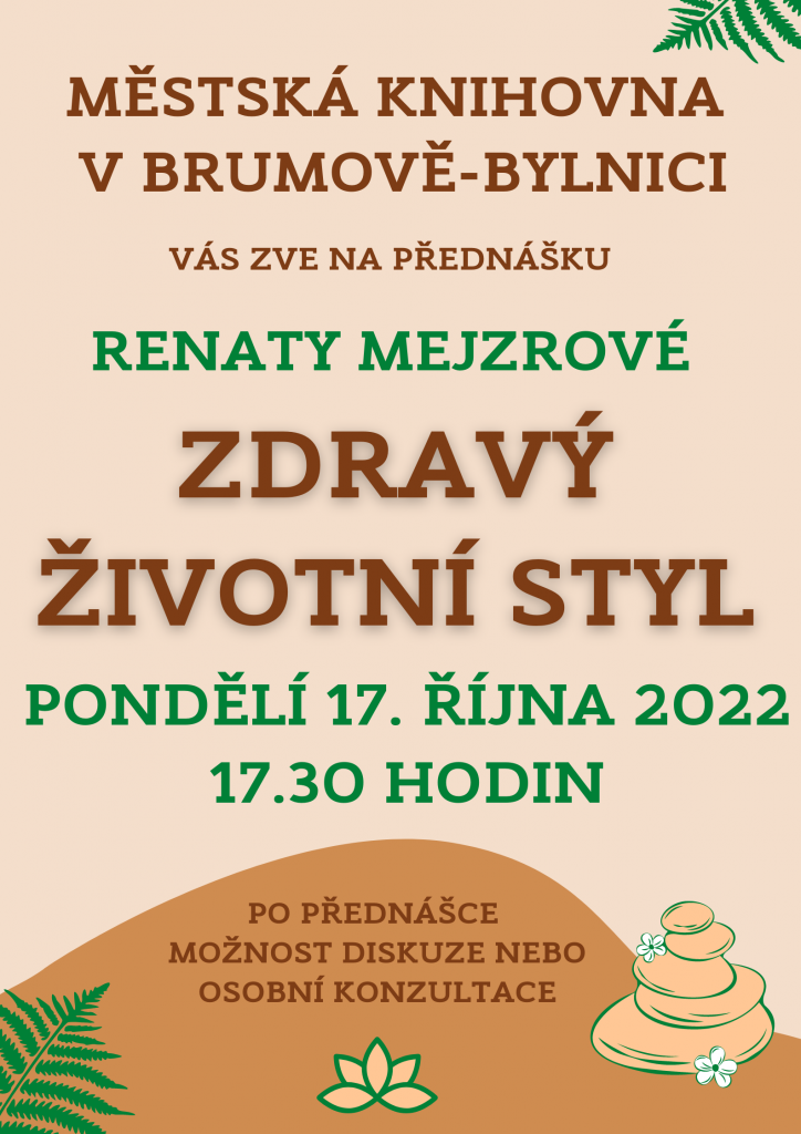 Městská knihovná Vás zve na přednášku Renaty Mejzrové ZDRAVÝ ŽIVOTNÍ STYL v pondělí 17. října 2022 v 17.30 v Městské knihovně Brumov-Bylnice.