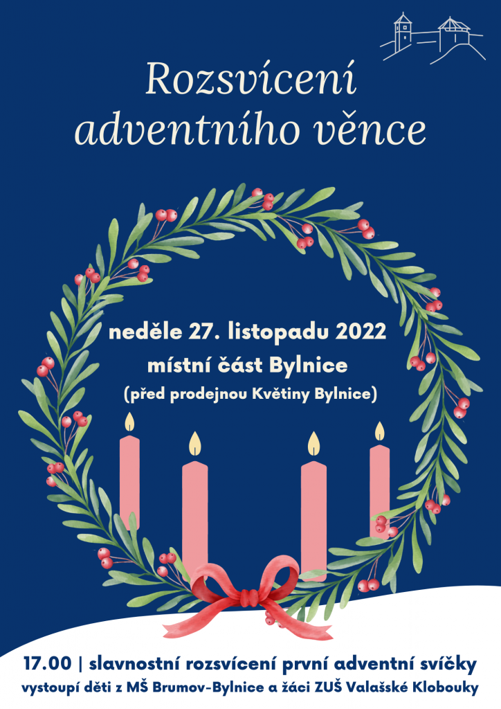 Srdečně Vás zveme k adventnímu věnci, který letos poprvé ozdobí naše město v bylnické části města (vedle prodejny Květiny Bylnice). První svíčku slavnostně rozsvítíme už tuto neděli 27. listopadu 2022 v 17 hod.