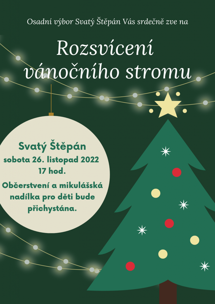 Osadní výbor Svatý Štěpán Vás zve na rozsvícení vánočního stromu, které se koná v sobotu 26. listopadu 2022 v 17 hod. ve Svatém Štěpáně. Mikulášská nadílka pro děti a občerstvení zajištěno. Těšíme se na Vás!