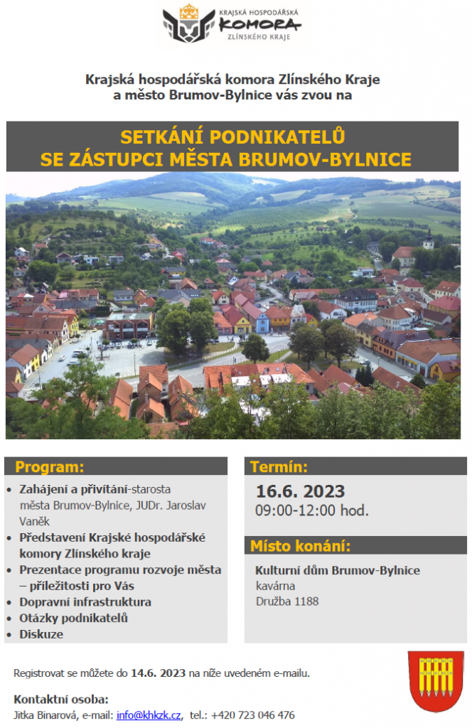 Krajská hospodářská komora a město Brumov-Bylnice zvou všechny podnikatele na setkání se zástupci města.