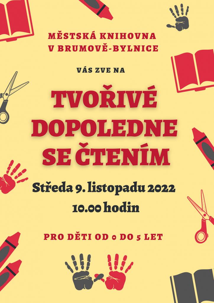 Městská knihovna Vás zve na TVOŘIVÉ DOPOLEDNE SE ČTENÍM, které se koná ve středu 9. listopadu 2022 v 10.00 v Městské knihovně v Brumově-Bylnici.