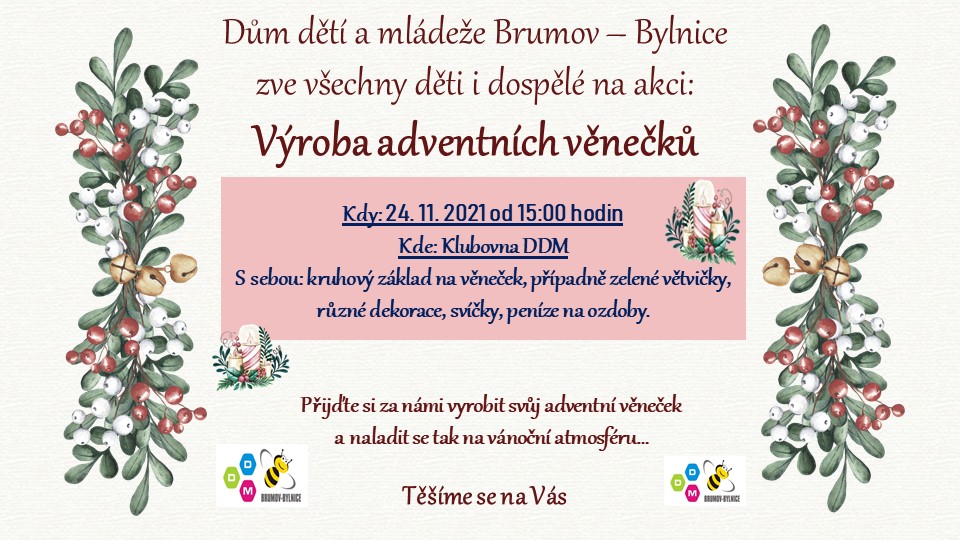 Dům dětí a mládeže Brumov-Bylnice zve všechny děti i dospělé na akci: Výroba adventních věnečků, která se uskuteční ve středu 24. listopadu od 15:00 v Klubovně DDM.