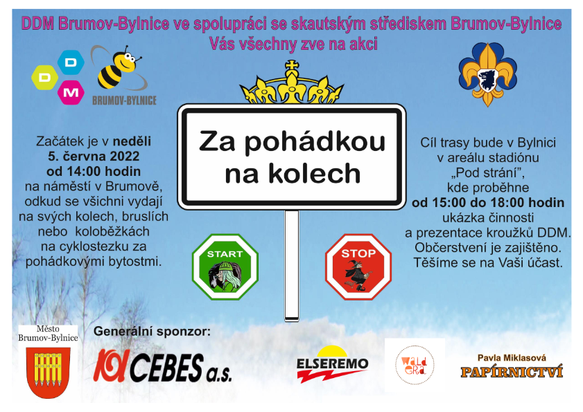 Začátek akce je v neděli na náměstí v Brumově-Bylnici, odkud se vydají na svých kolech, bruslích, koloběžkách na cyklostezku za pohádkovými bytostmi. Cíl trasy bude v Bylnici v areálu "Pod strání" kde proběhne od 15:00 hod. do 18:00 hod. ukázka činnosti kroužků DDM. Občerstvení je zajištěno. Těšíme se na Vaši účast.