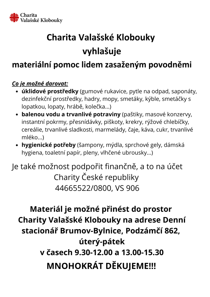 Prosíme také o podporu veřejné sbírky na pomoc po povodních, kterou administruje Charita Česká republika.