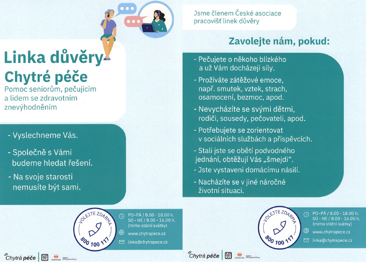 Linka důvěry Chytré péče je sociální službou, která poskytuje telefonickou podporu a pomoc pro ty, kteří se ocitli v náročné životní situaci. Lidé na linku důvěry volají s tématy jako je osamělost, smutek, špatný zdravotní stav, komplikované vztahy v rodině, duševní onemocnění či finanční tíseň. Někdo potřebuje poradit, někdo spíš vyslechnout a sdílet, obojí je v pořádku.
