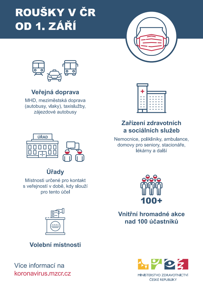 Od 1. září budou povinné roušky ve vybraných vnitřních prostorech