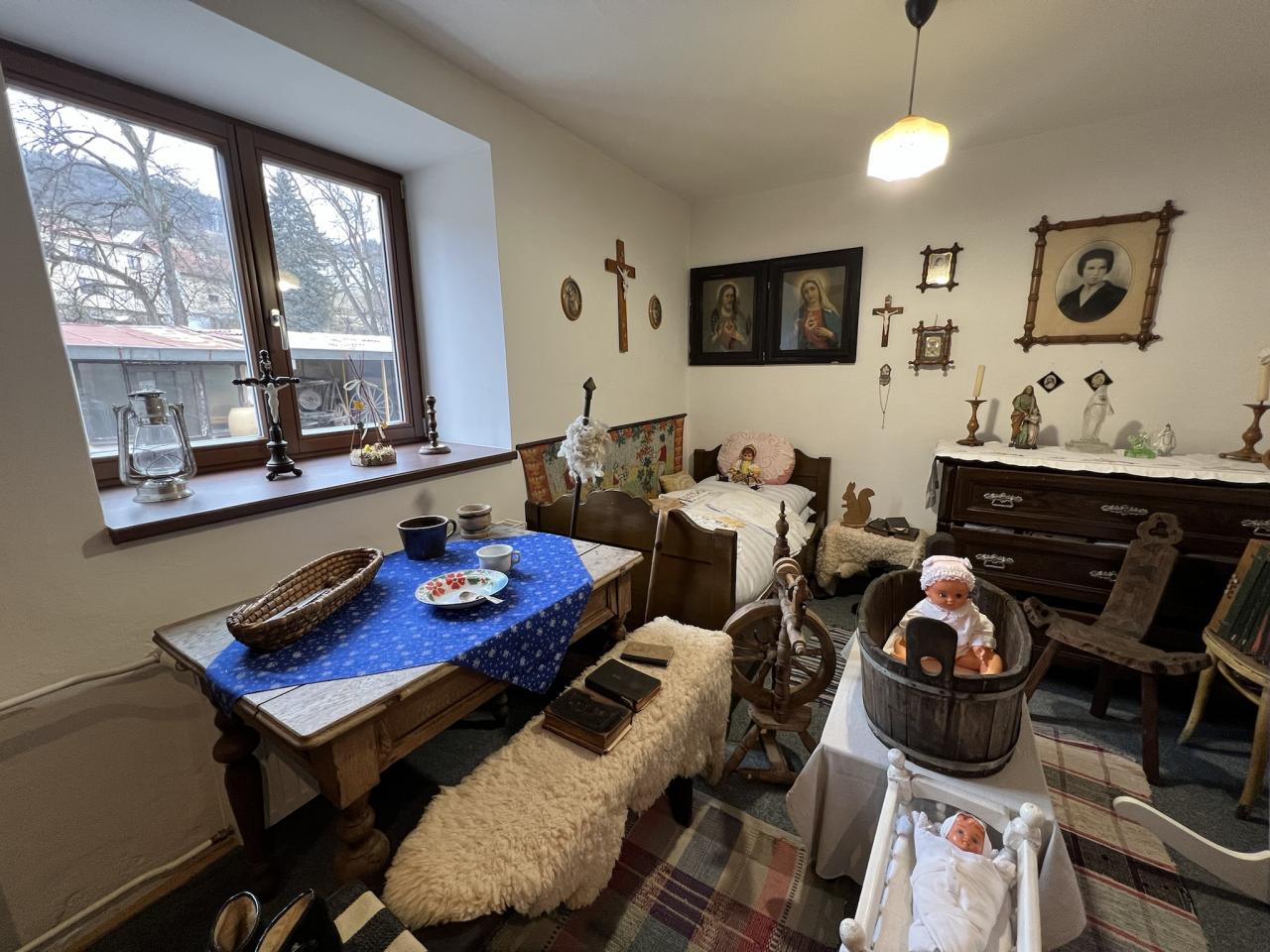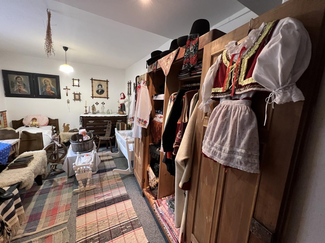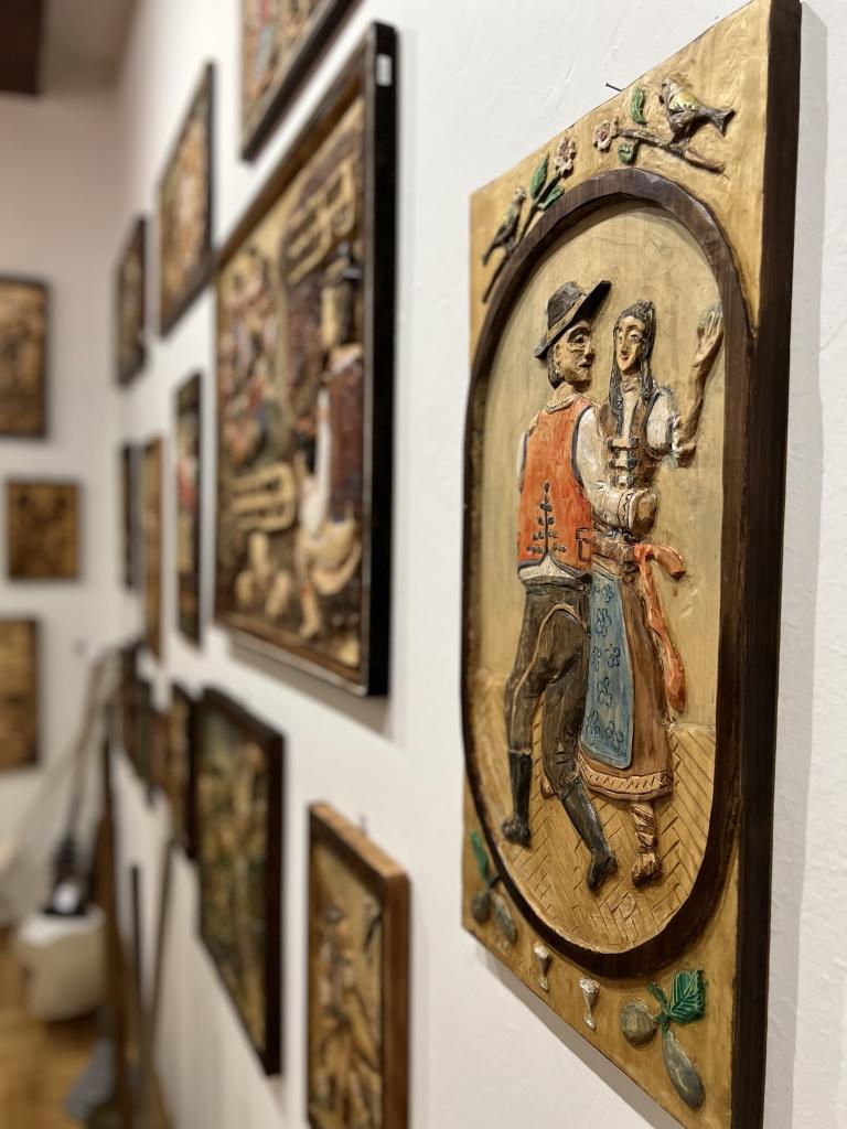 Stěny muzea jsou zdobeny ručně vyráběnými dřevořezbami pana Jaroslava Lišky.